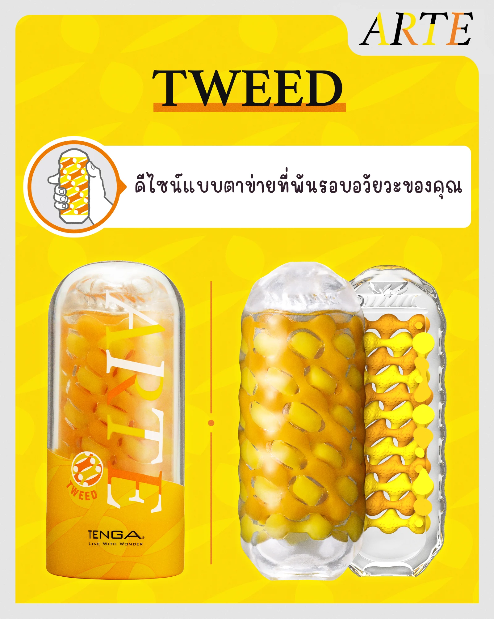 Tenga Arte รุ่น Tweed ของเล่นรุ่นใหม่จาก Tenga ที่ถูกออกแบบมาเพื่อตอบสนองทุกความต้องการ ทั้งรูปลักษณ์ที่สวยงาม ใช้งานง่าย และช่วยกระตุ้นอารมณ์ได้อย่างมีประสิทธิภาพด้วยมือของคุณเอง รุ่น Tweed มาพร้อมดีไซน์ตาข่ายที่โอบล้อมรอบอวัยวะของคุณ มอบสัมผัสที่อ่อนโยนแต่ต่อเนื่องเมื่อบีบหรือถูใช้งาน